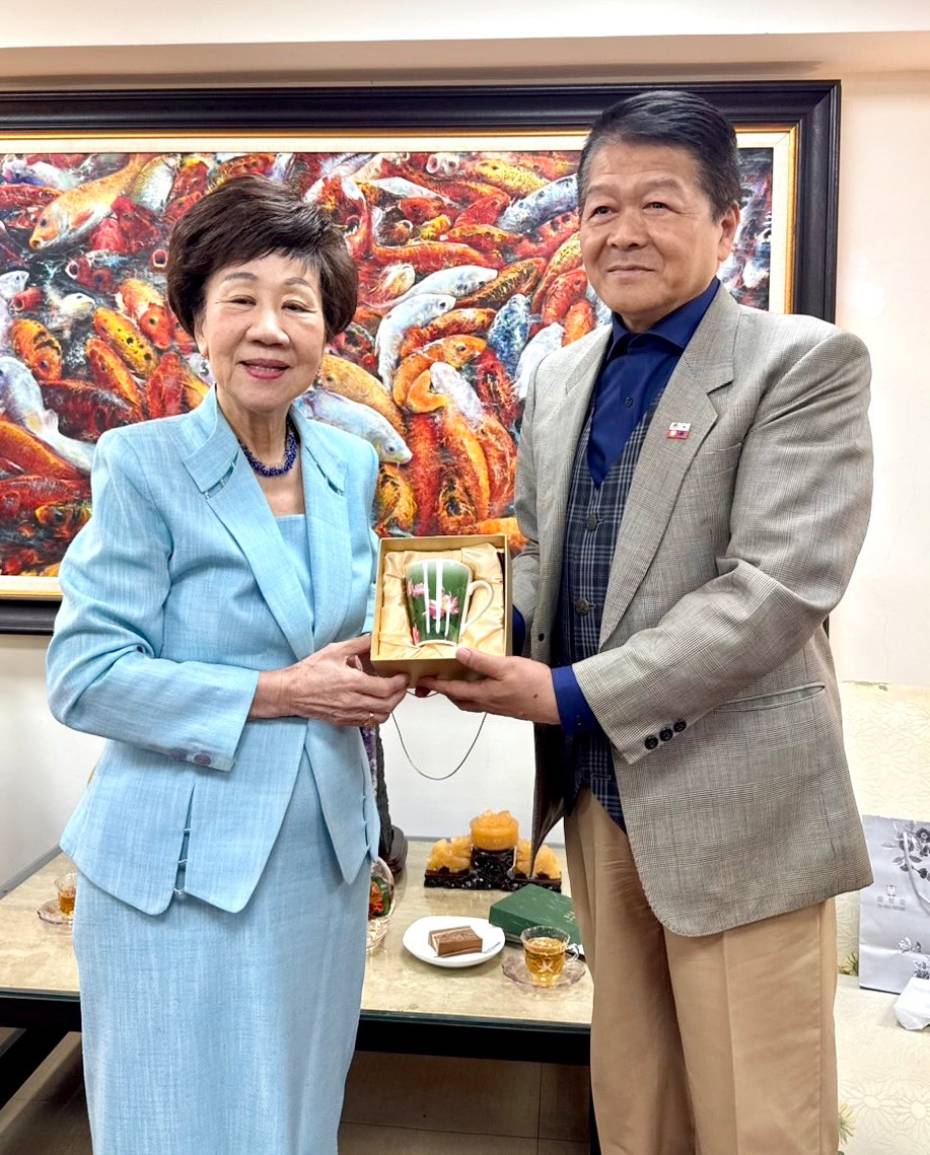 呂秀蓮前副總統致贈具理念象徵意義的紀念杯予 「Aim 國家產業發展集團」總會長劉意川,象徵雙方攜手以誠信治理與和平價值為基礎,推動台韓產業交流與國際合作之願景。圖/Aim國家產業發展集團提供