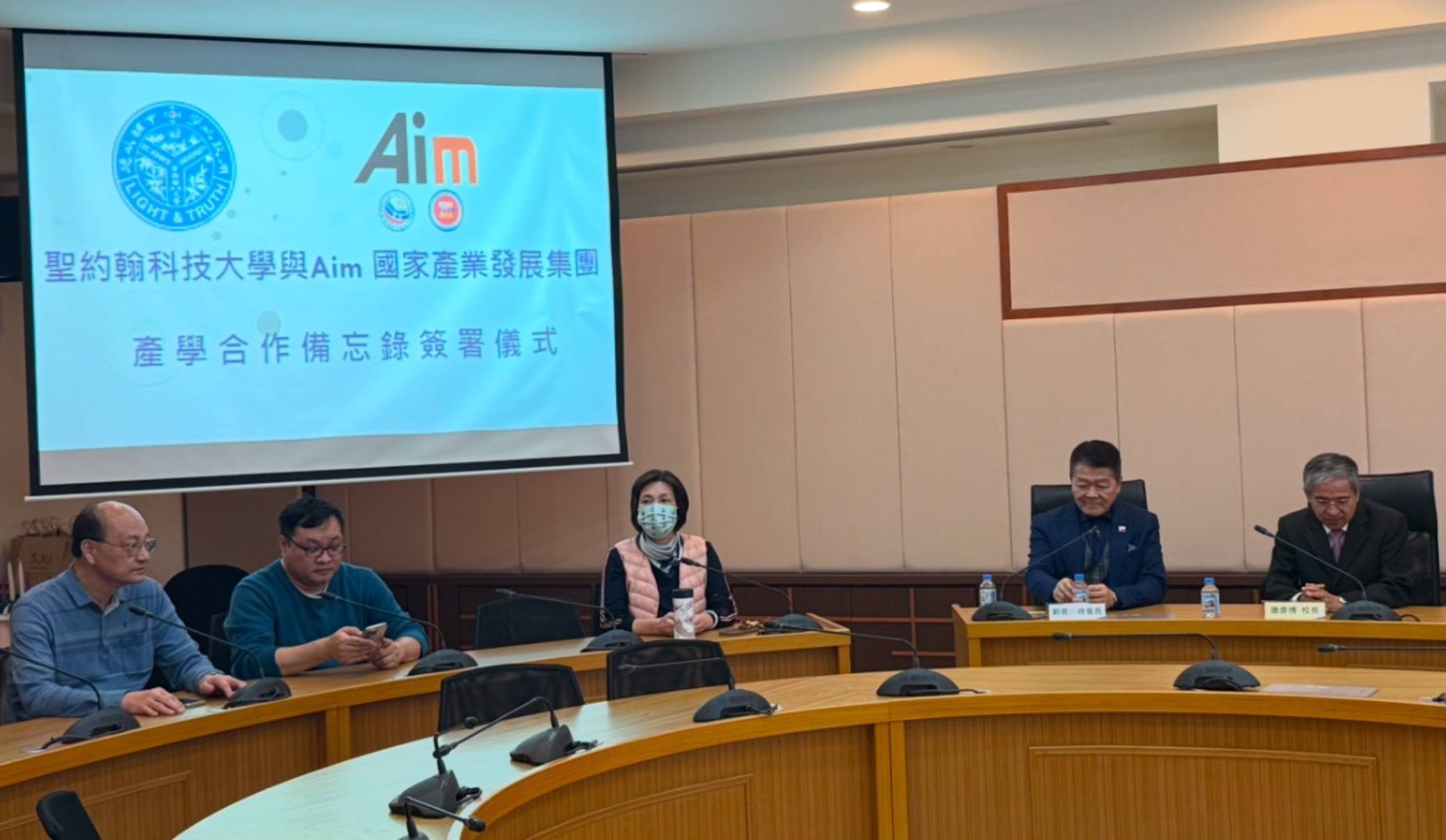 聖約翰科技大學與 Aim 國家產業發展集團舉行產學合作備忘錄簽署儀式,雙方聚焦高等教育國際化、產業人才培育及跨域合作機制,就產學政策連結與全球趨勢進行交流,展現教育與產業攜手回應國際競爭環境、培育新世代關鍵人才的共同願景。圖/Aim國家產業發展集團提供