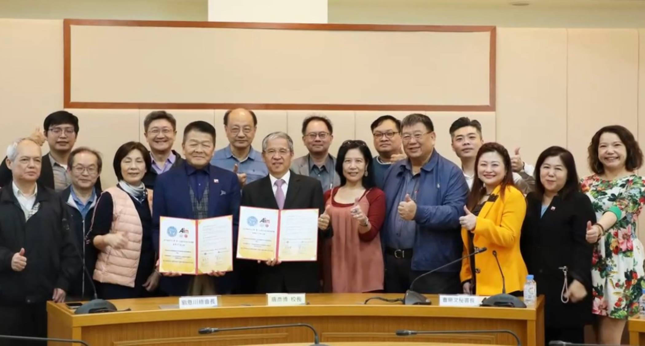 雙方與會團隊合影留念,現場氣氛熱絡而融洽,展現跨界交流所激盪出的多元能量。透過面對面的互動與共識凝聚,為後續在教學、實務與國際連結等面向的合作,鋪陳具體而可延伸的合作空間。圖/Aim國家產業發展集團提供