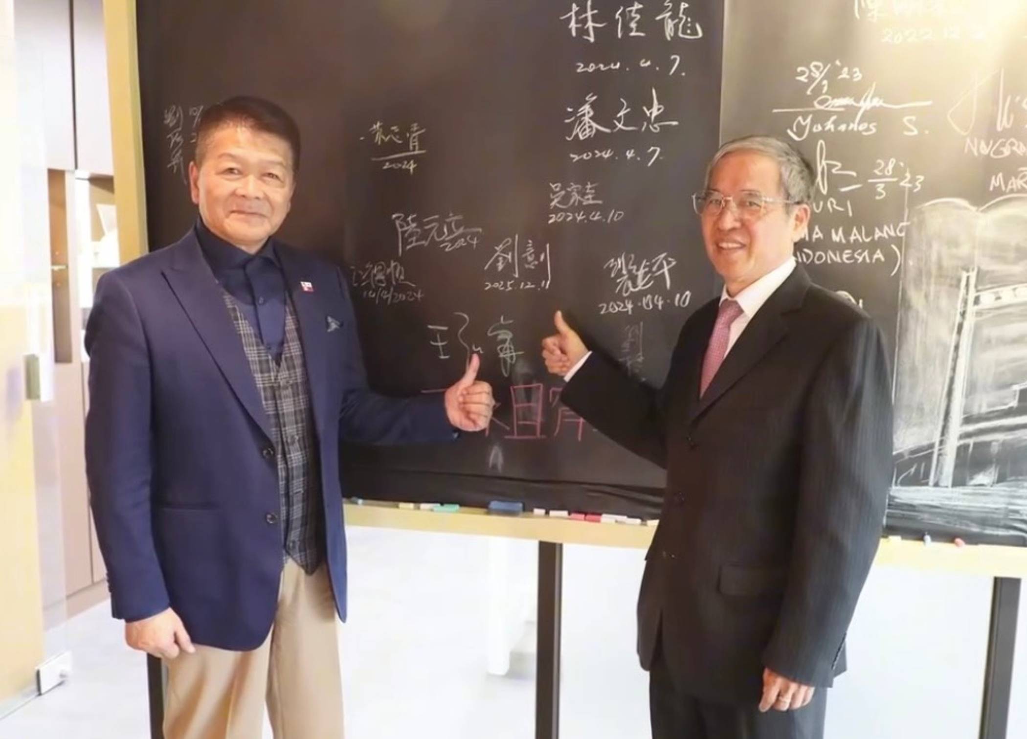 唐彥博校長博士(右)邀請劉意川總會長於校內名人牆前簽名留念,象徵對來訪情誼與共同理念的重視。這一筆簽名不僅留下珍貴紀錄,也為校園累積跨界交流的歷史印記,展現學校持續拓展視野、連結外界的開放精神。圖/Aim國家產業發展集團提供