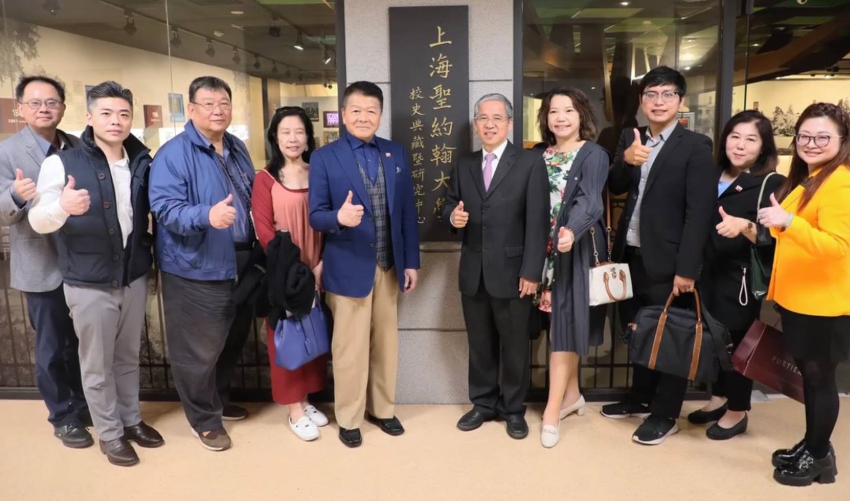 一行人駐足於校園具歷史意義的展示空間前合影留念,背景所承載的不僅是建築與文字,更映照出學校長年累積的教育精神與文化脈絡。圖/Aim國家產業發展集團提供