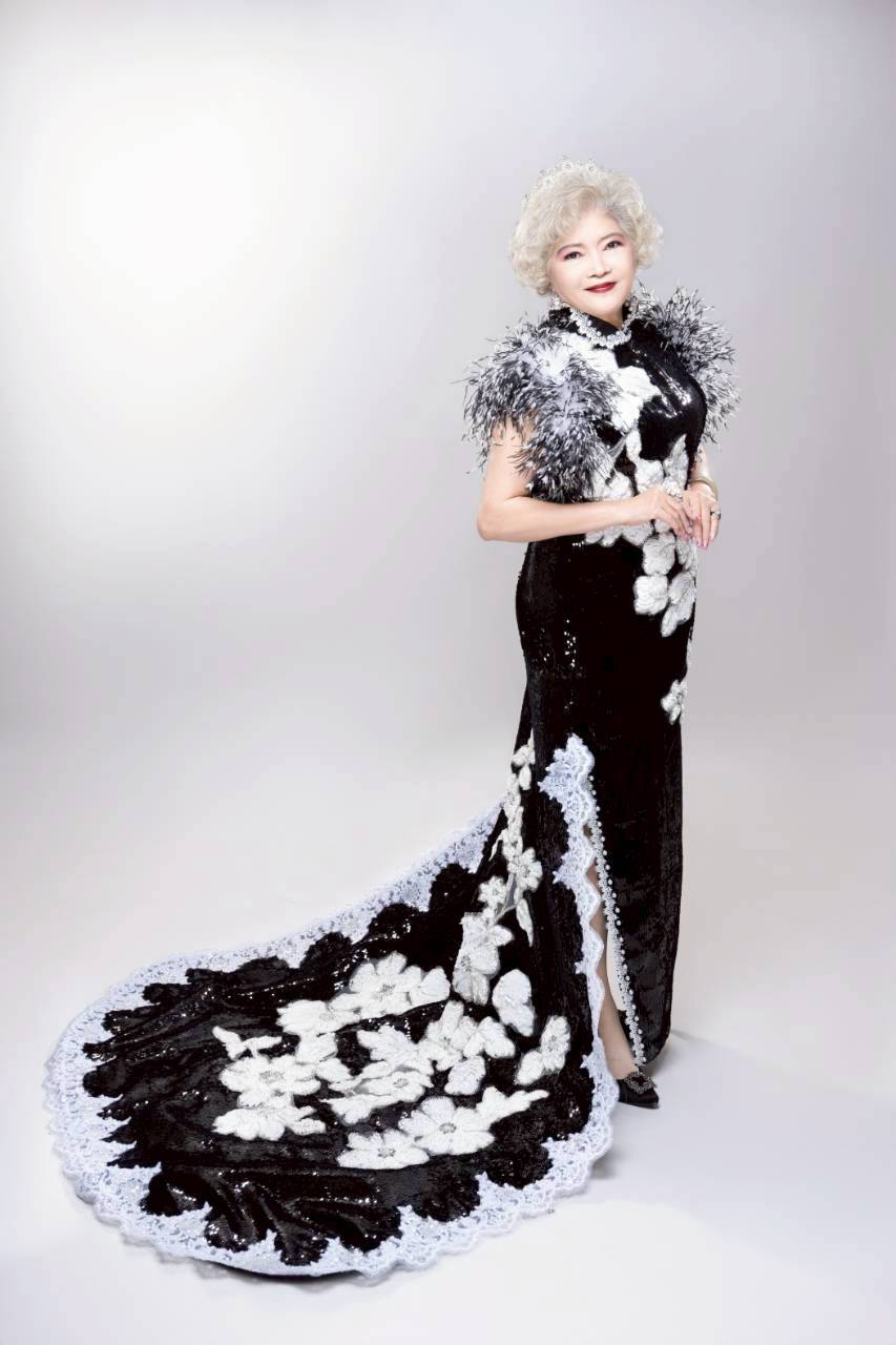 袁念華身著黑白花卉拖尾禮服優雅亮相,璀璨細緻的工藝與立體羽飾相映成輝,展現雍容大氣與東方美學的現代詮釋,風采萬千。圖/俞悠遊提供
