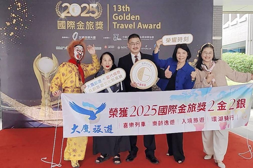 大鷹旅遊攜手當代傳奇,融合文化創意元素開創旅遊新風貌,深獲旅客口碑熱推與金旅獎雙重肯定。當代傳奇負責人林秀偉老師親率美猴王團隊現場祝賀。圖/大鷹旅遊提供
