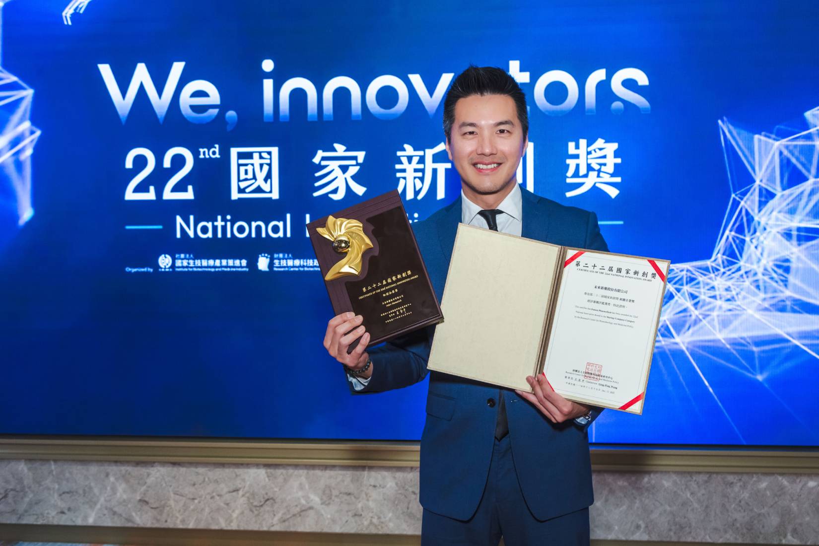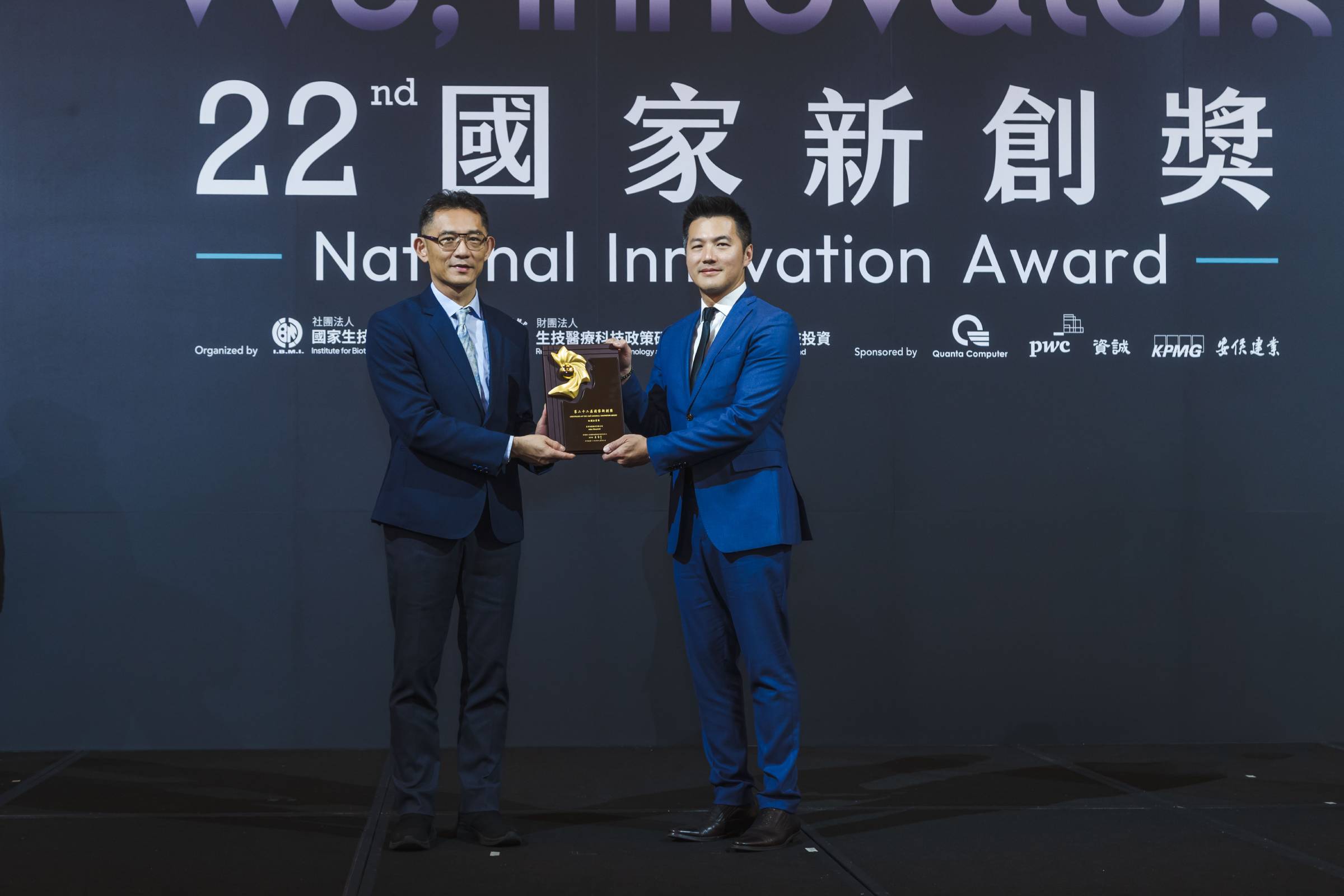 未來新藥憑藉突破性的醫藥研發成果,榮獲第22屆「國家新創獎」,由未來新藥創辦人招名威博士(右)代表領獎。圖/未來新藥提供