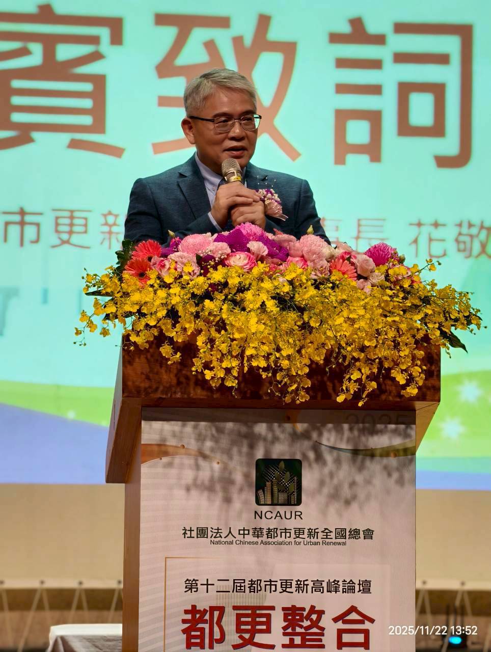 中華資產鑑定中心董事長楊三峰於「第十二屆都市更新高峰論壇」中代表合辦單位致詞,強調推動整合制度法制化的重要性,期盼以專業與制度共同促進都更效率提升。圖/中華資產鑑定中心提供