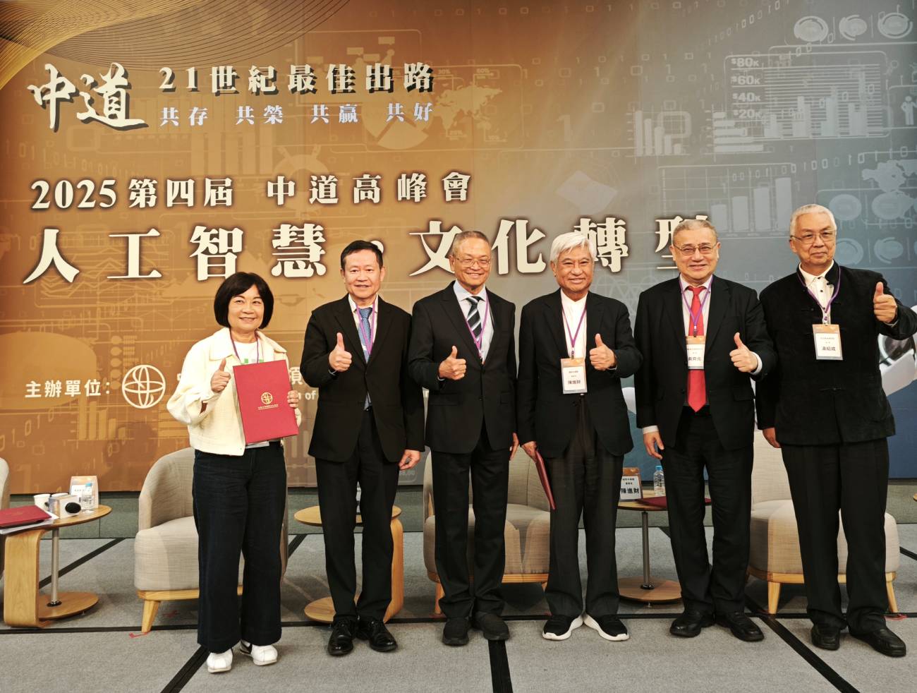 2025第四屆中道高峰會「焦點論壇Ⅱ」圓滿落幕,象徵在 AI 時代以中道智慧連結科技、永續與文化的新方向(左起:陳春山董事長、趙涵㨗校長、張培鏞董事長、陳樹理事長、黃琇琳執行長、夏允中理事長)。圖/中華中道領導文化總會提供