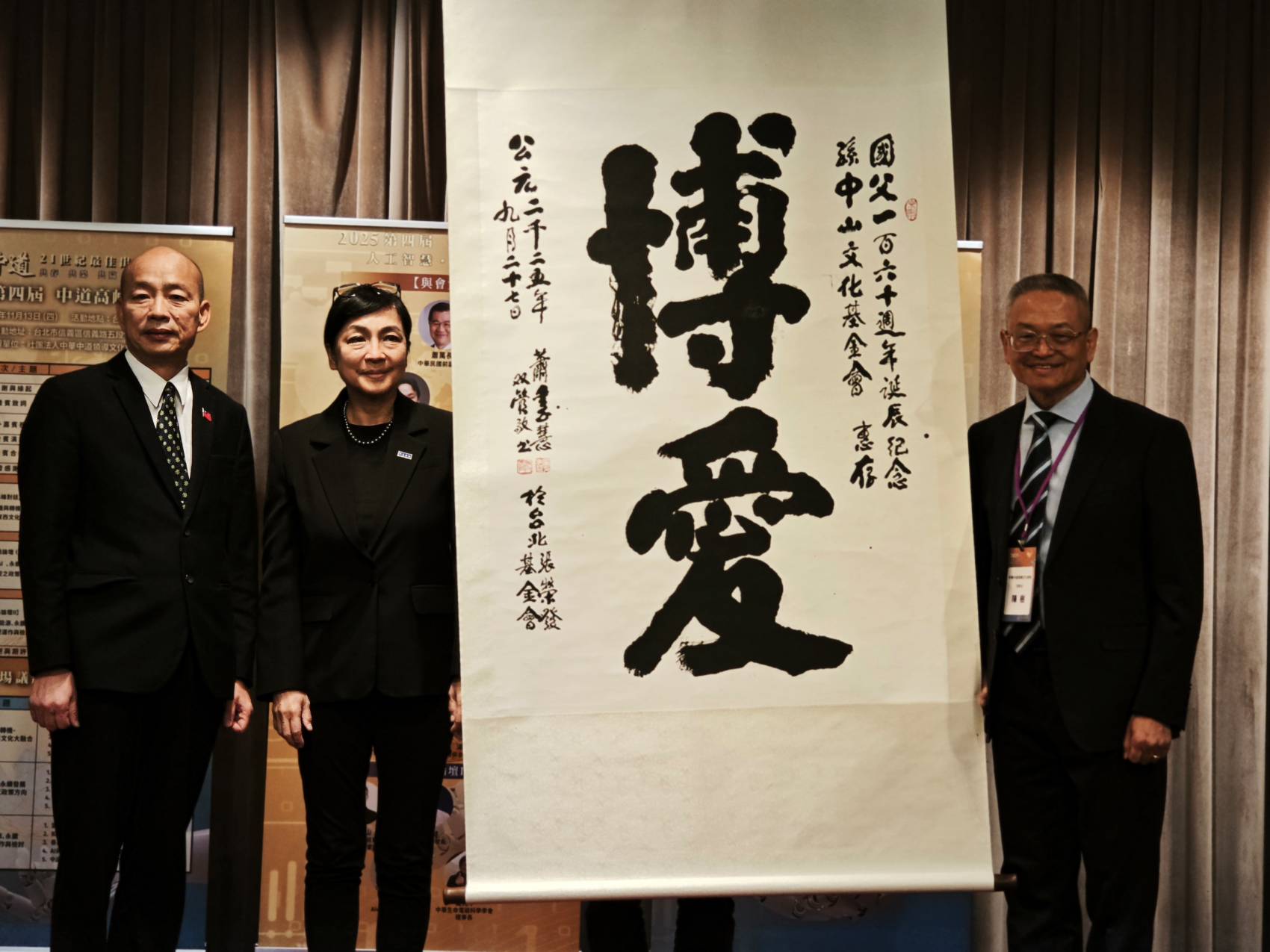 韓國瑜院長於書法作品〈博愛〉前合影留念,在中道精神與先賢理念的象徵下,呼應高峰會對「文化承續與時代新生」的核心價值(左起:立法院院長韓國瑜、國父孫中山後人孫雅麗、中華中道領導文化總會理事長陳樹)。圖/中華中道領導文化總會提供