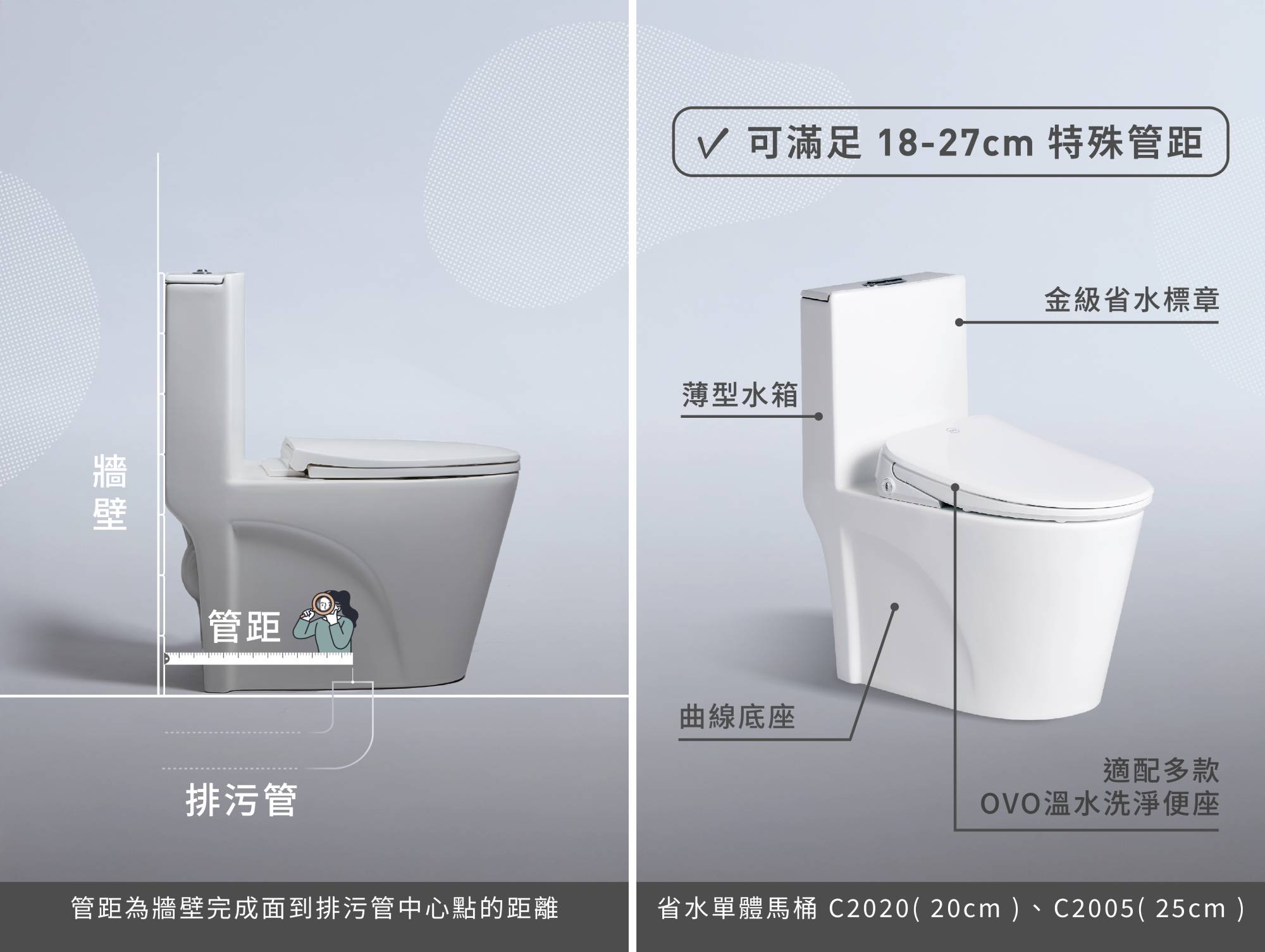 因應民眾常見的規格限制問題, OVO 京典衛浴亦規劃兩款支援 18 至 27 公分特殊管距的省水單體馬桶,除取得金級省水標章,馬桶水箱與底座更為一體燒製而成的無接縫設計,兼顧實用性與簡約外型。OVO 京典衛浴表示,顧客亦可升級搭配瞬熱型溫水洗淨便座、感應沖水閥等項目,進一步提升日常使用舒適度,以協助顧客在裝修時找到真正適合的衛浴解決方案。