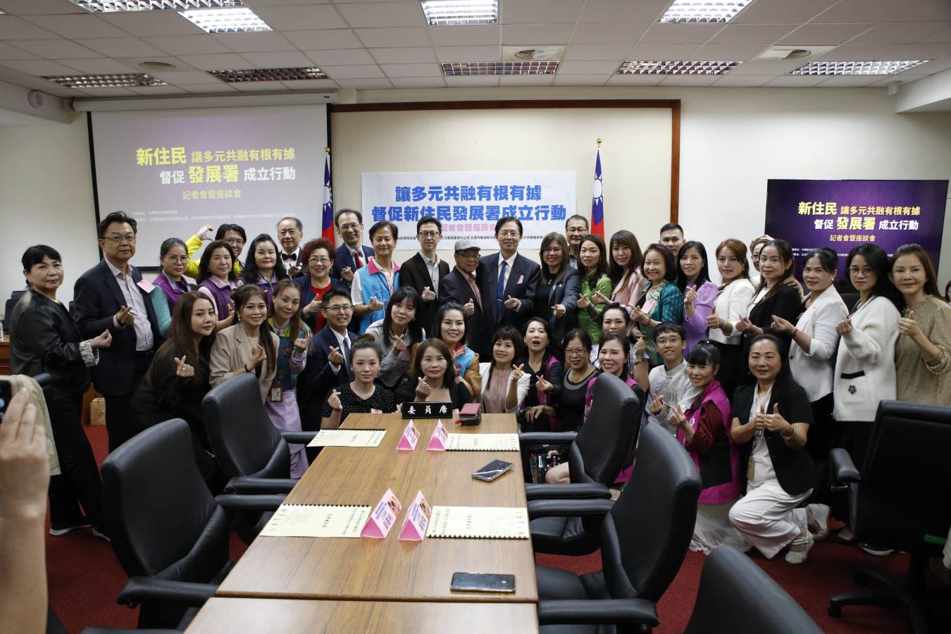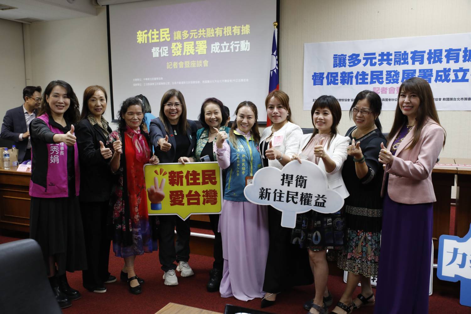 多位立法委員手持標語共同合影,展現對新住民議題的關注,並以具體行動呼籲政府完善相關機制,打造更友善的支持環境,讓多元族群在台灣安心發展。圖/麥玉珍立法委員國會辦公室提供