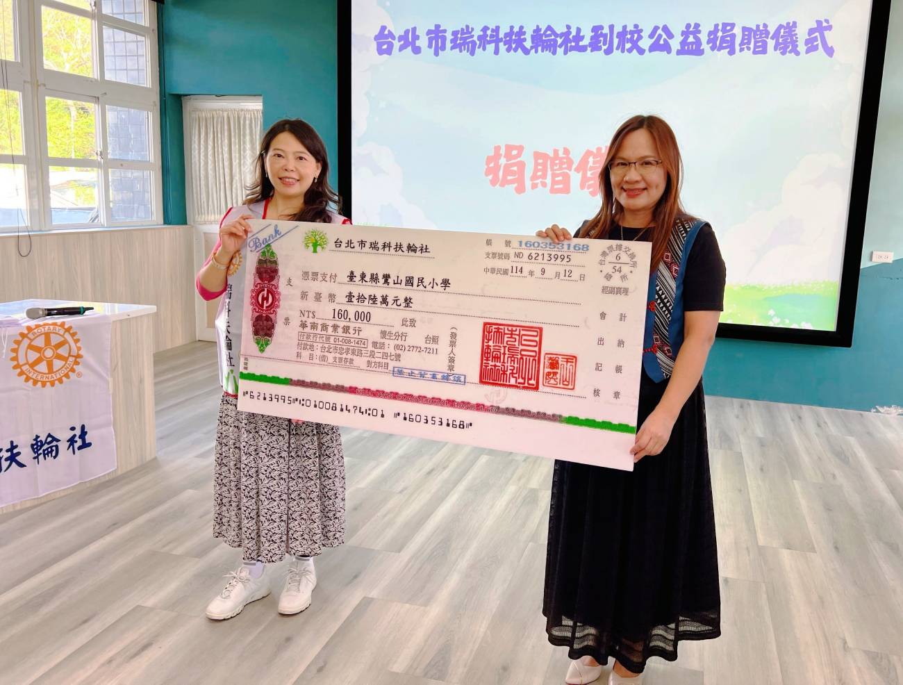 鸞山國小校長林素慧(右)接受台北市瑞科扶輪社社長王馨妤捐贈教育經費,感謝守護偏鄉學童學習權益。圖/上準工程公司提供