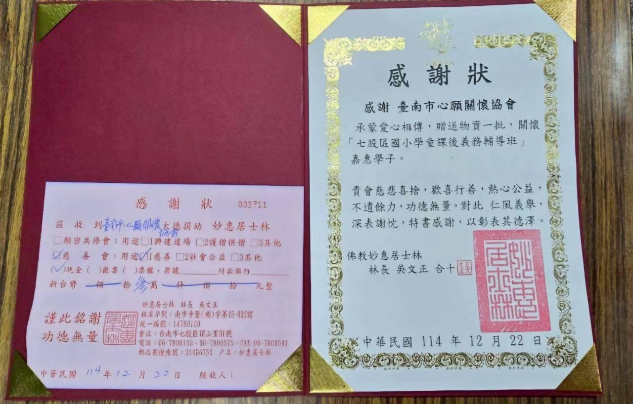 七股區的「國小學童課後義務輔導班」自2004年由妙惠居士林創辦人吳文正先生發起,肩負偏鄉教育使命,默默守護單親、隔代教養、清寒等弱勢家庭學童。21年來,課輔班從國小延伸至後港國中、昭明國中及北門高中,提供穩定、安全、溫暖的學習環境,陪伴數百名孩子走過求學路,更成為七股地區善行教育的重要典範。