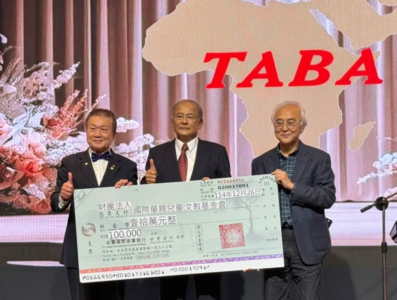 台灣非洲經貿協會展現公益關懷精神,TABA顧問林銘仁(左)出資、並以協會名義捐贈予「國際單親兒童文教基金會」,由新任理事長黃志鵬(中)代表致贈,基金會董事長楊其文代表受贈,象徵在推動台非經貿之餘,也持續投入社會善行。圖/台灣非洲經貿協會提供