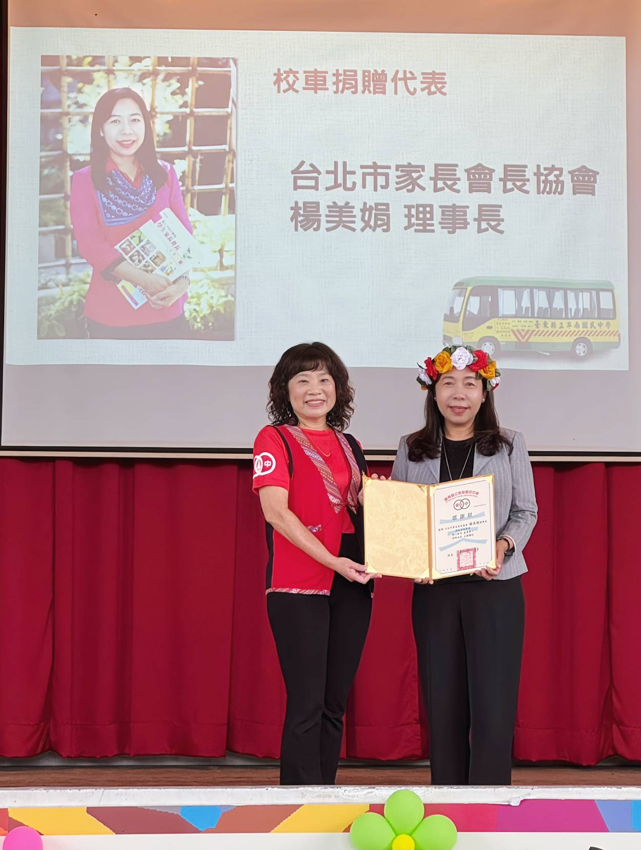 臺北市家長會長協會理事長楊美娟(右)於卑南國中校慶捐贈典禮中接受校方頒贈感謝狀,象徵各界攜手支持偏鄉教育,為學子打造更安全便利的通學環境。圖/台北市家長會長協會提供