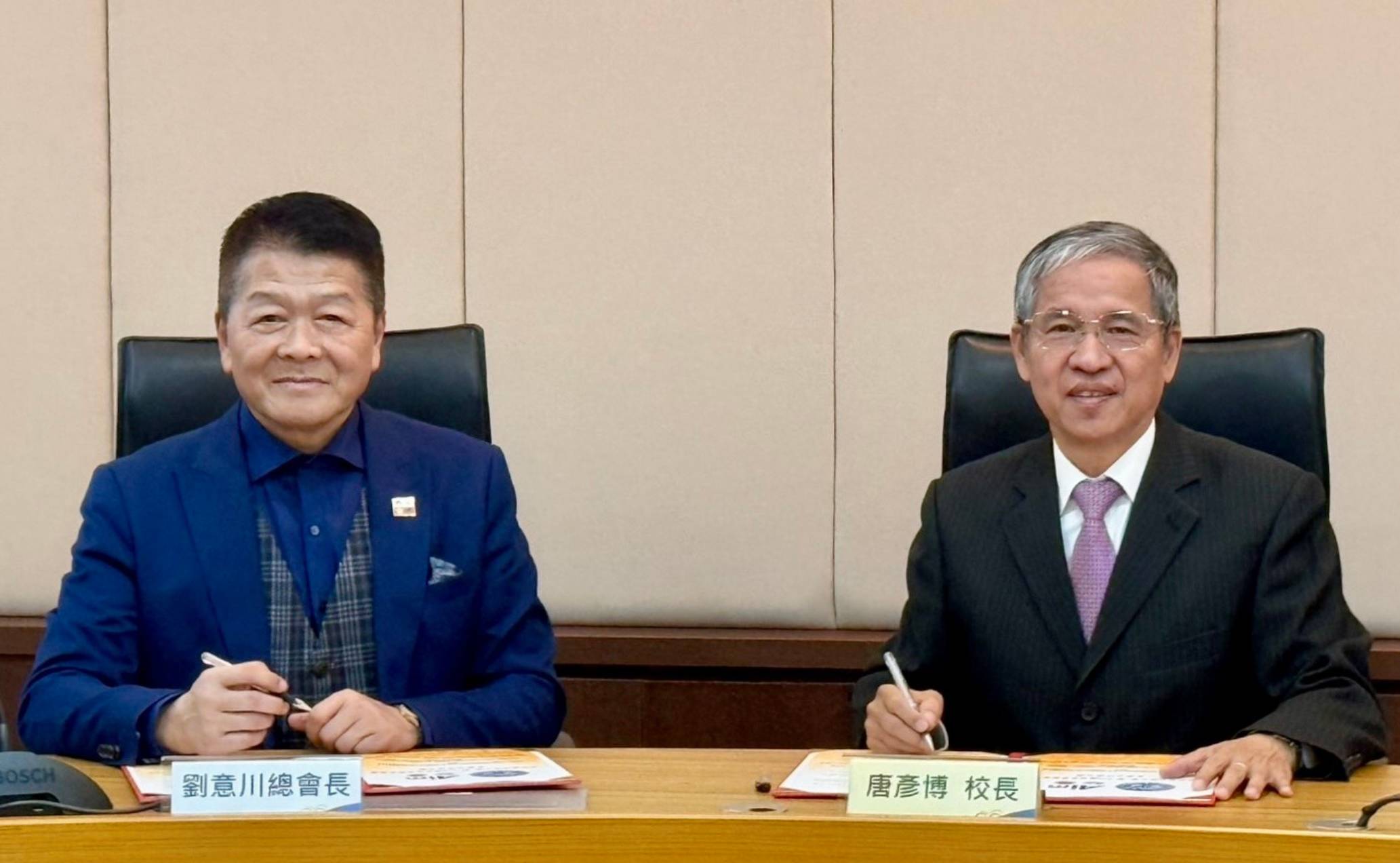 唐彥博校長博士(右)邀請劉意川總會長於校內名人牆前簽名留念,象徵對來訪情誼與共同理念的重視。這一筆簽名不僅留下珍貴紀錄,也為校園累積跨界交流的歷史印記,展現學校持續拓展視野、連結外界的開放精神。圖/Aim國家產業發展集團提供