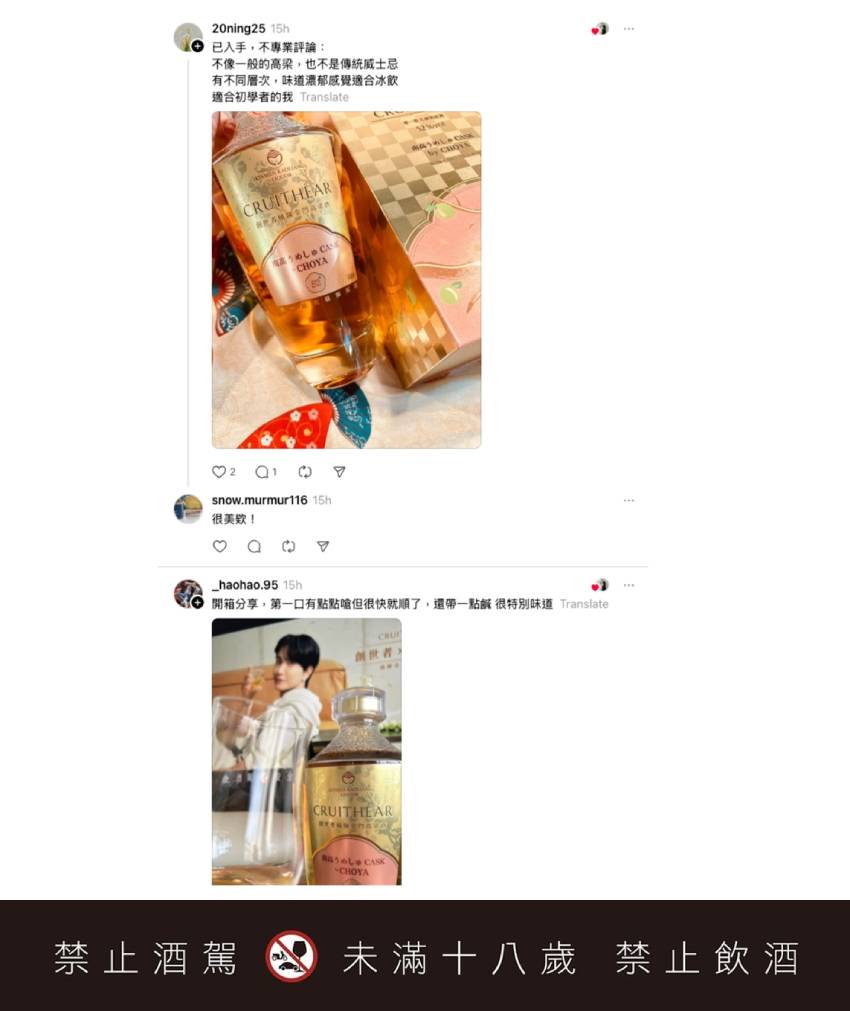 創世者桶陳金門高粱酒系列自推出以來,就受到網友熱烈喜愛,這次推出的「創世者×CHOYA桶陳金門高粱酒」,採用日本梅酒品牌 CHOYA 的桶陳工藝,讓高粱酒在曾釀梅酒的橡木桶中熟成。開瓶即可聞到梅果的鹹鮮香氣,隱約帶有紅茶與咖啡渣香調;入口後明亮甜鮮感轉化為辛香料氣息,尾韻帶出淡淡香水與檀香,這樣的跨界嘗試突破傳統烈酒印象,成功拉近年輕族群與多元消費者的距離,為經典品牌注入新鮮活力,再加上有利特代言,酒款上市消息一出即引來高度話題。