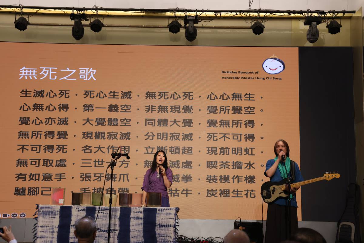 壽宴由甫獲2025年英國倫敦IMVA最佳音樂MV大賞的 Jot Taj「燦爛之光樂團」揭幕演出,以洪禪師著作《無死》、《覺不離身》詩偈譜曲,結合民謠、爵士、新世紀及佛曲,開創嶄新的現代真言梵唄風格,以音聲供養,為大師祝壽。