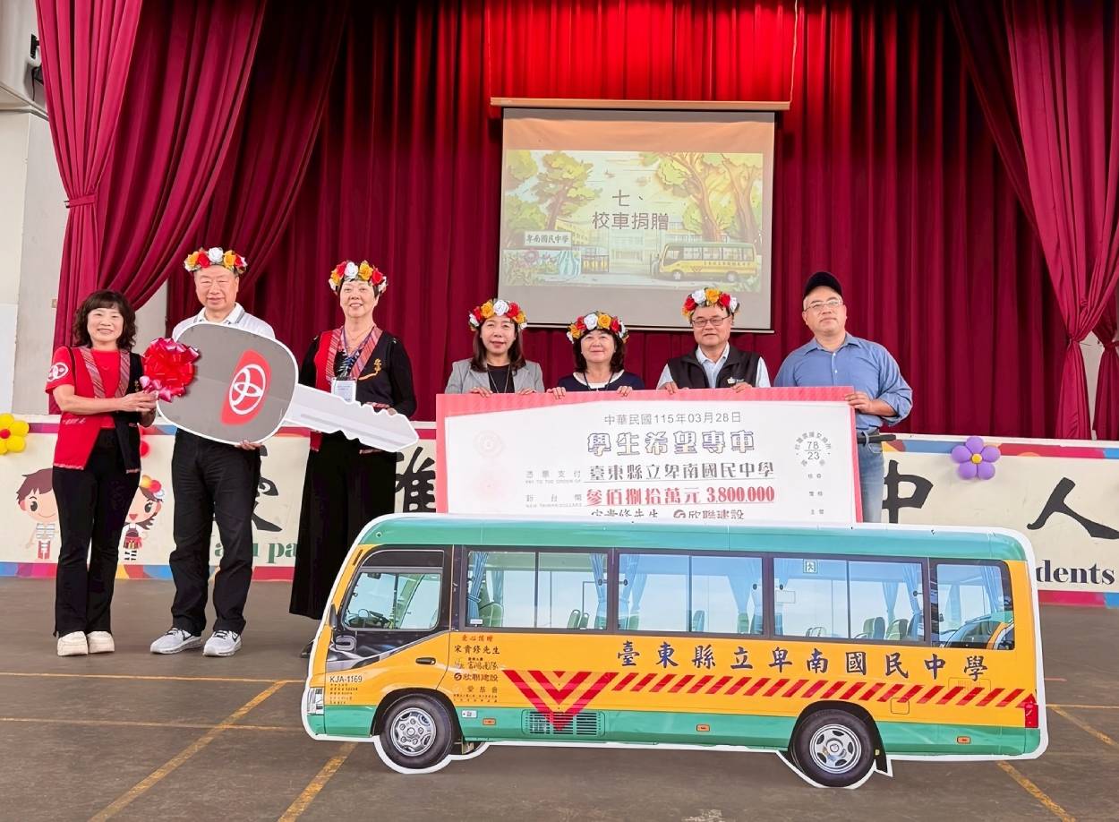 為改善偏鄉學子通學困境,在台北市家長會長協會理事長楊美娟的發起與號召下,結合愛心第二春文教基金會、欣聯建設、富邦人壽富鴻團隊、及宋貴修先生等各界善心力量,共同募資捐贈價值近新台幣400萬元的全新校車乙部,為臺東縣立卑南國中打造更安全便利的通學環境。捐贈典禮於3月28日校慶活動中舉行,展現跨界攜手支持偏鄉教育的溫暖力量。